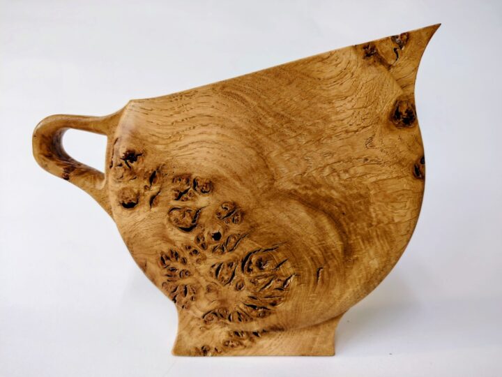 One of my Jugs this time in Burr Oak . 15cm high by 18cm from spout to handle. Base is 3.5cm at the base tapering to the rim. On sale at £180.00