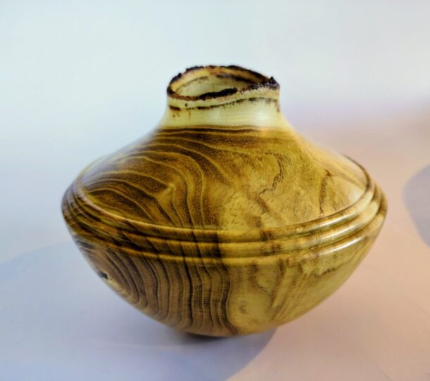 This bowl is 230mm diameter by 100mm high. Made from a beautiful piece of burr oak with a bog oak rim to provide contrast. Selected by the Association of Woodturners for their travelling exhibition in […]